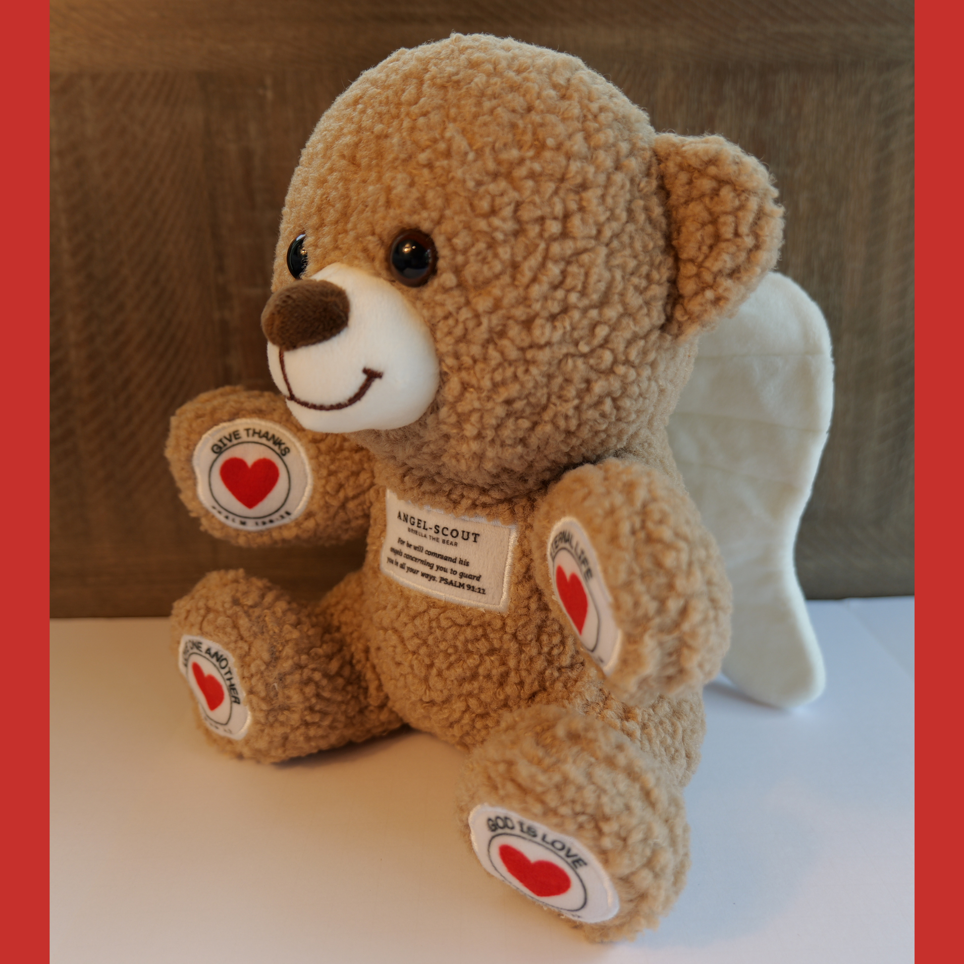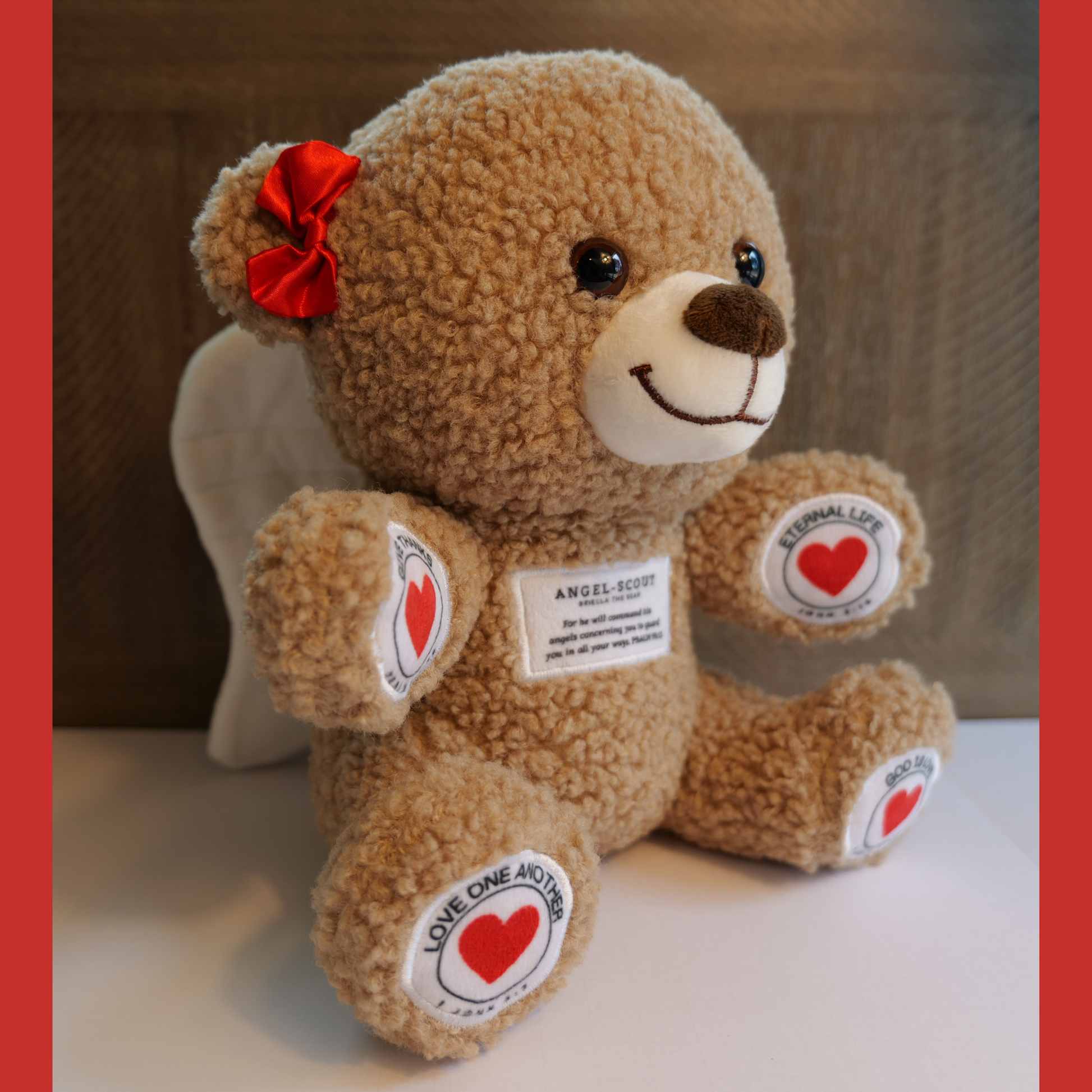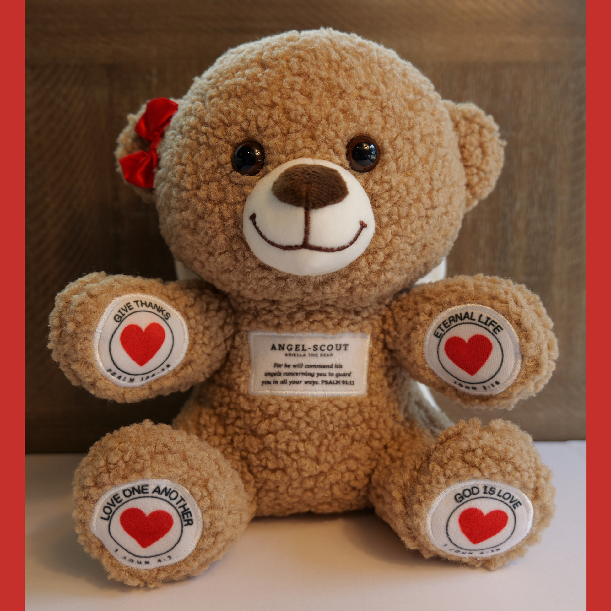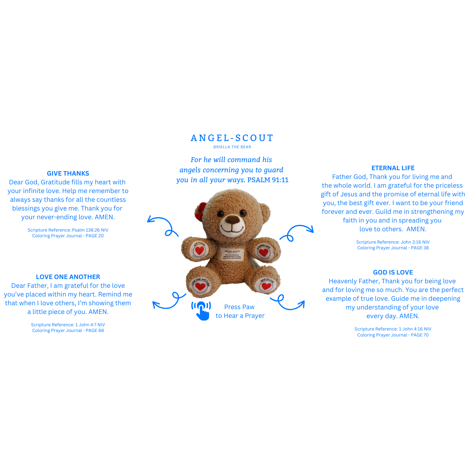 Meet Angel-Scout Briella, your child’s cuddly companion for peaceful moments, heartfelt prayers, and a reminder of God’s loving protection. With a gentle press of her paw, Briella recites four soothing prayers and bedtime blessings, each inspired by Scripture and designed to nurture a child’s faith.