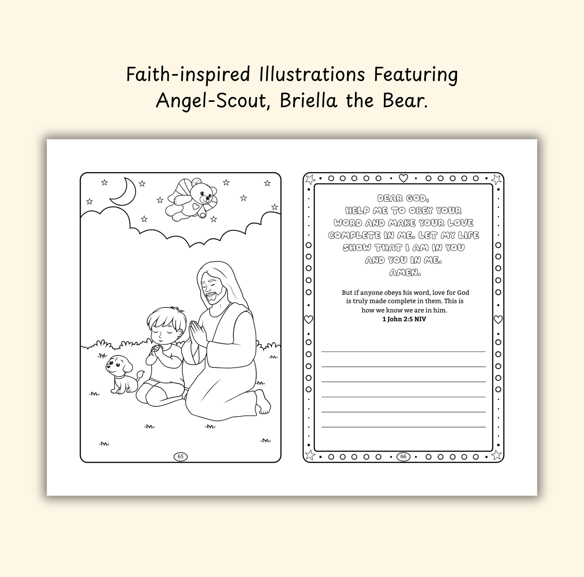 Four of the verses and prayers inside this journal are also featured in the Angel-Scout talking plush toy! Children can listen, color, and pray along as their Angel-Scout friend recites the same loving messages — creating an interactive, faith-filled experience that brings God’s Word to life.