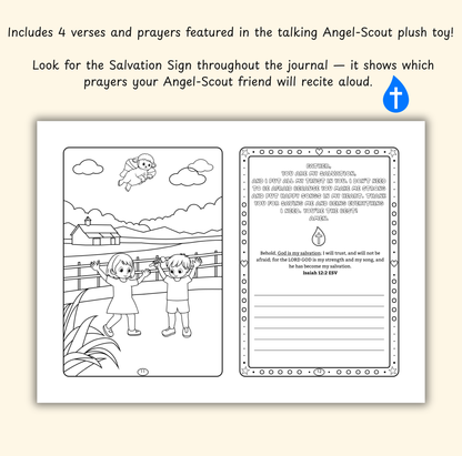 Four of the verses and prayers inside this journal are also featured in the Angel-Scout talking plush toy! Children can listen, color, and pray along as their Angel-Scout recites the same comforting messages — creating an interactive, faith-filled experience that brings Scripture to life.